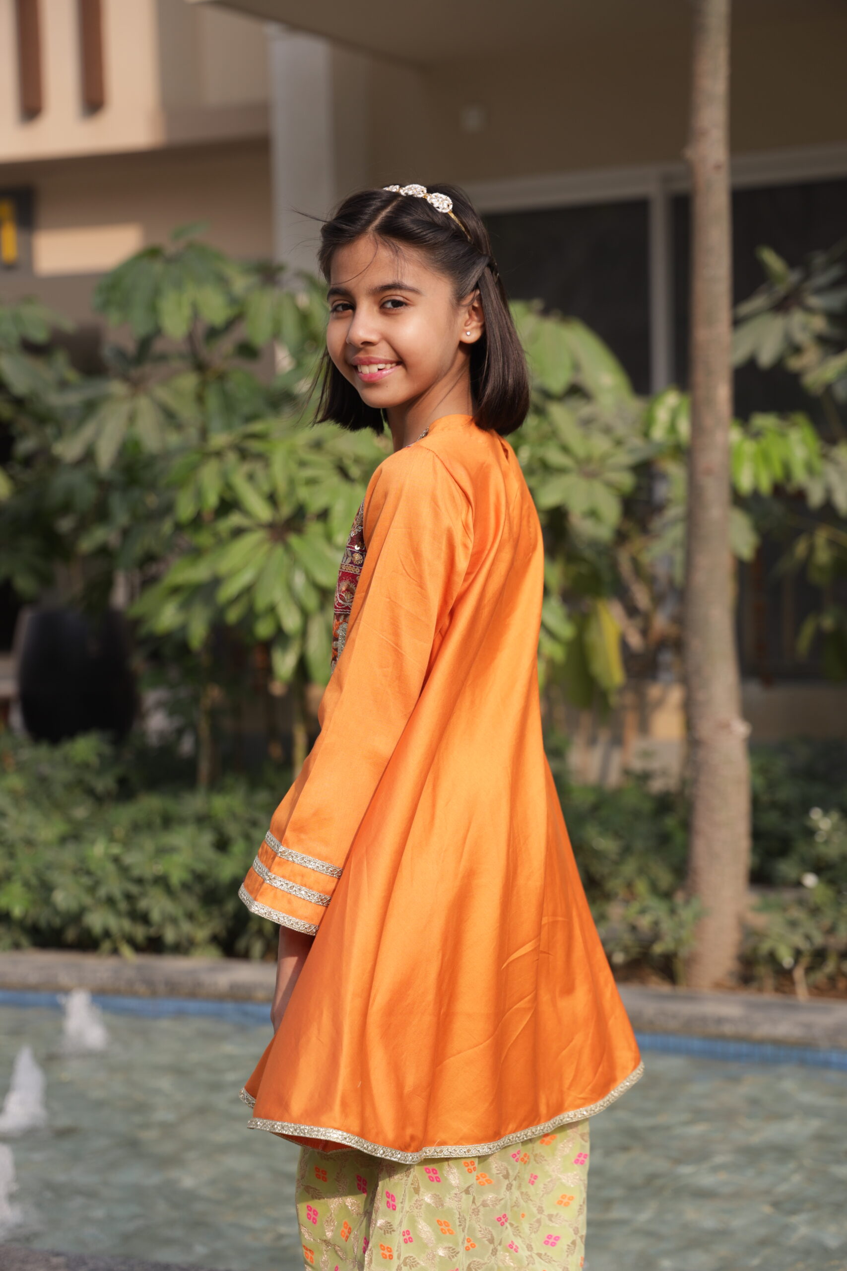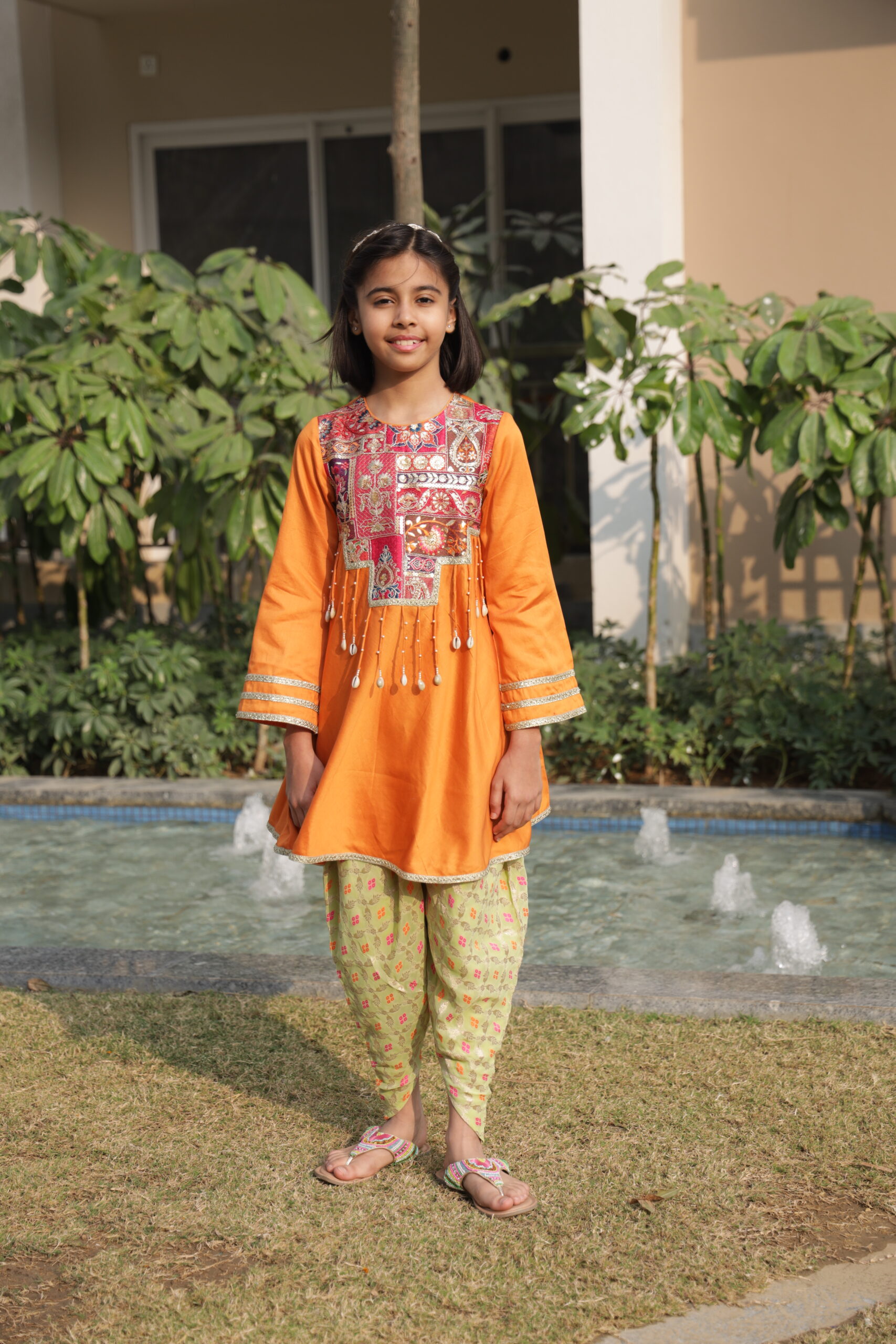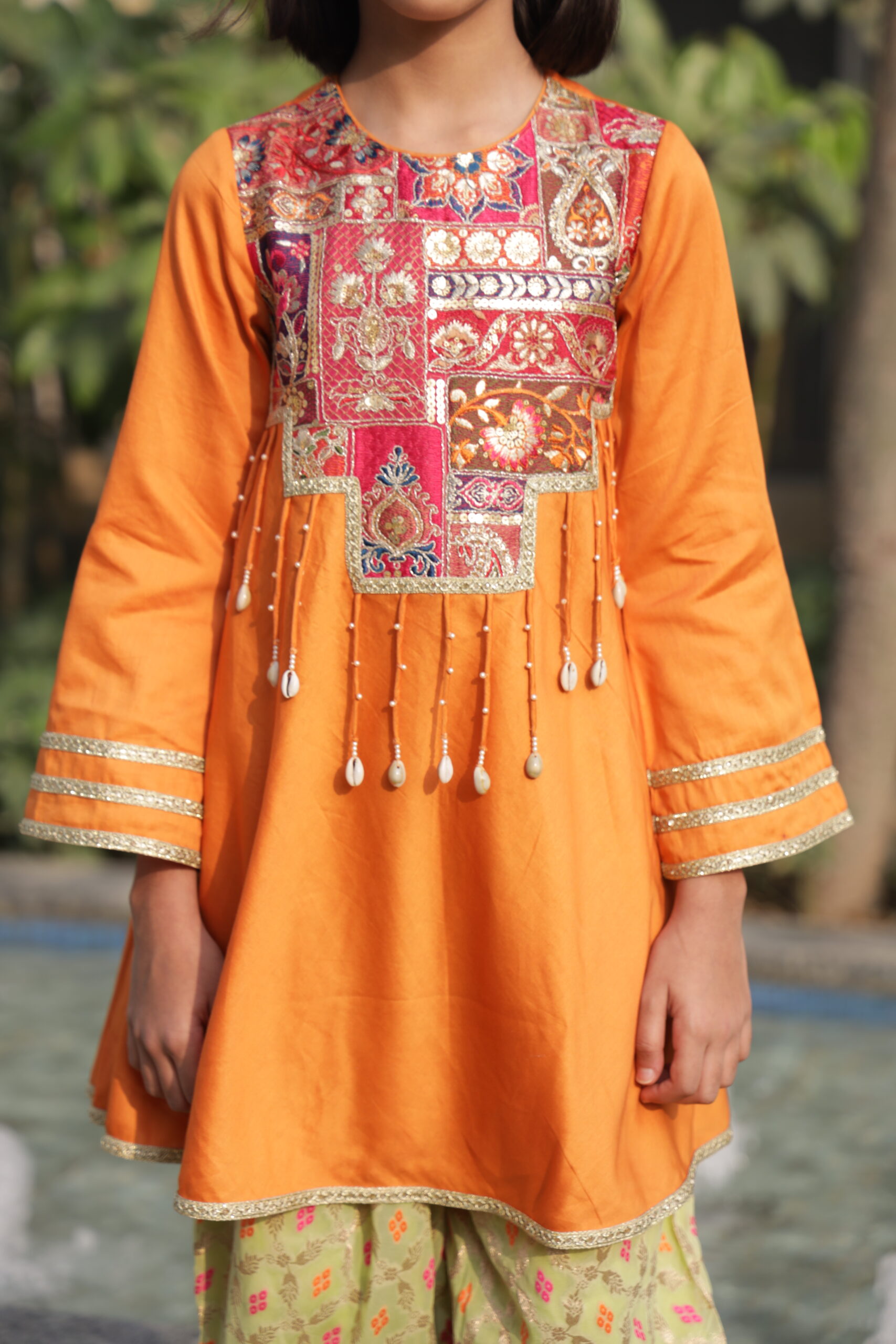 | a cotton kurta with embroidered yoke and dori hanging detailing with a bhandhej print tulip pants . |
