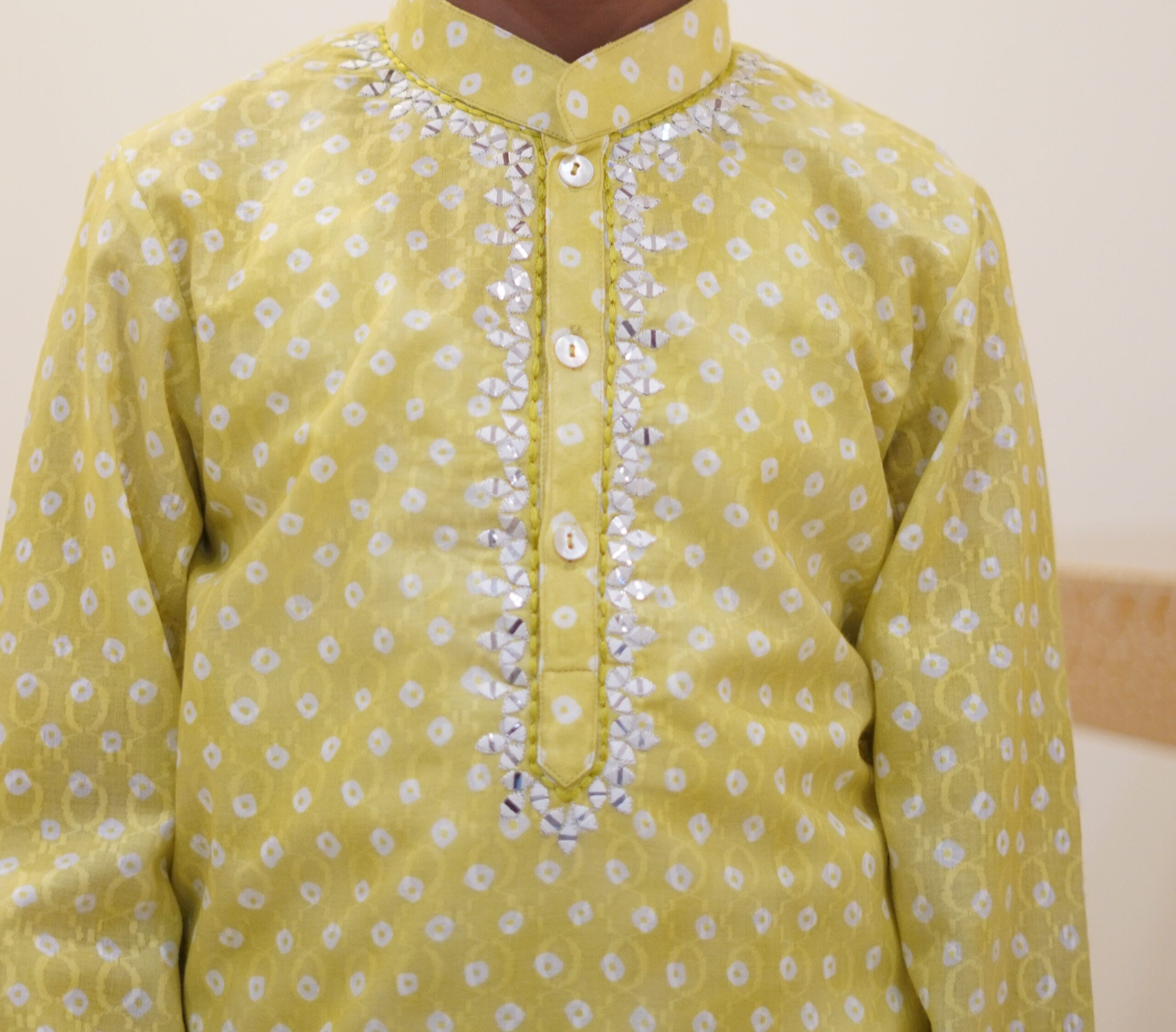 | Lemon Green Kurta Set, featuring an off-white print pattern and faux mirror embroidery, paired with classic off white pants. |