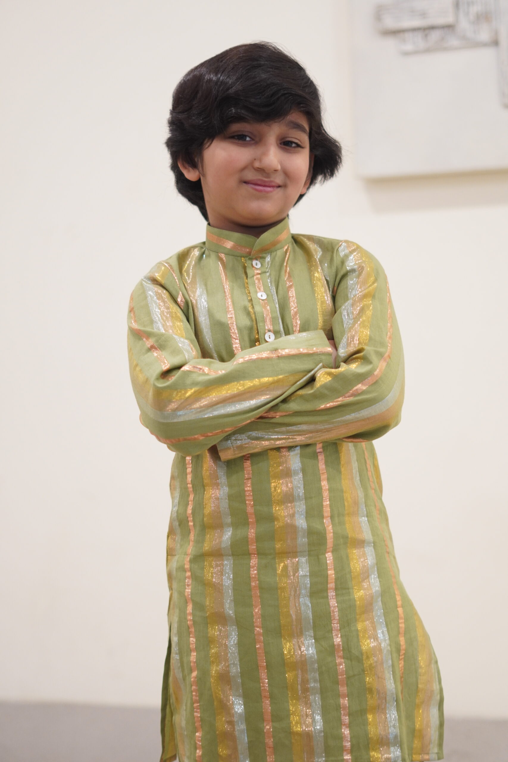 | Cotton green Striped Kurta paired with Off-White Pants. |