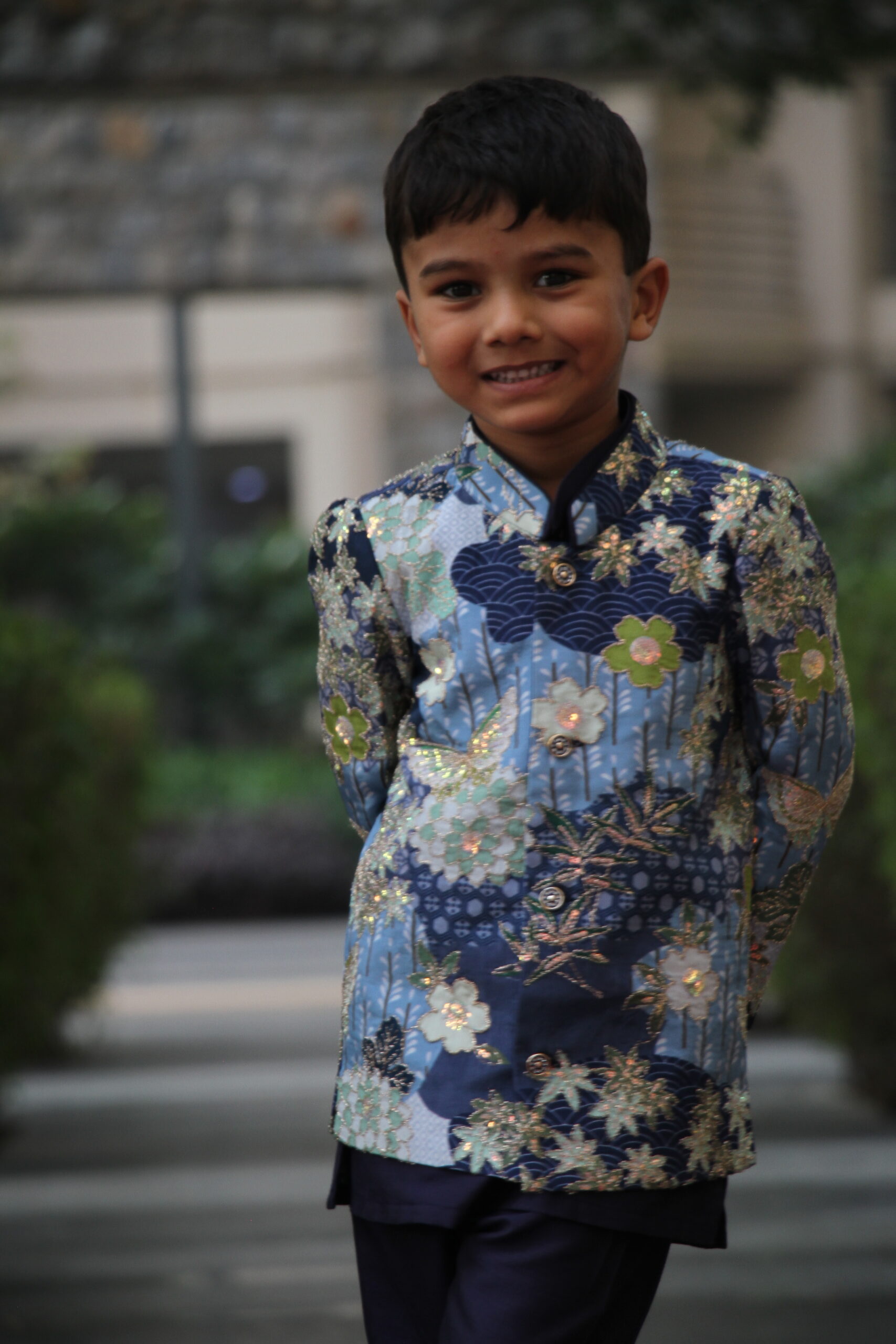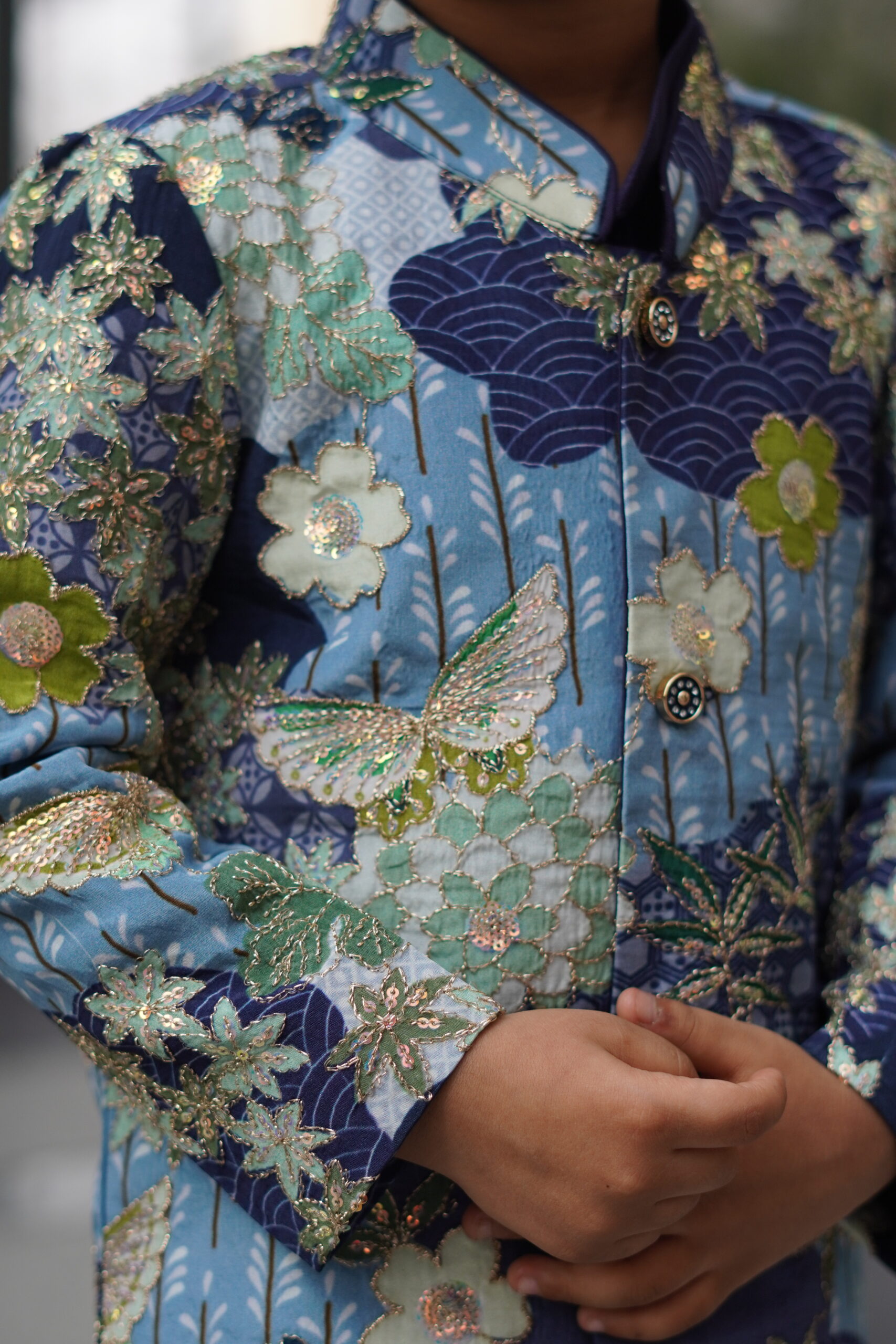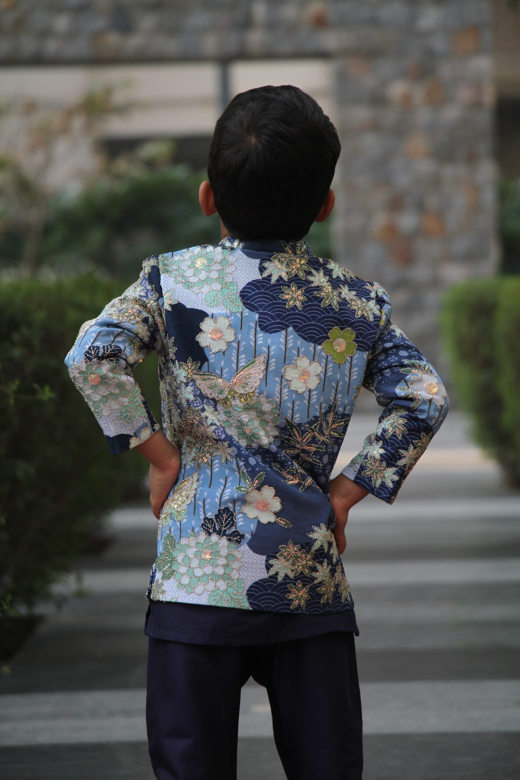 | navy blue floral embroidered Jodhpuri outfit. The set includes a sophisticated jacket paired with a matching kurta and pajama, |