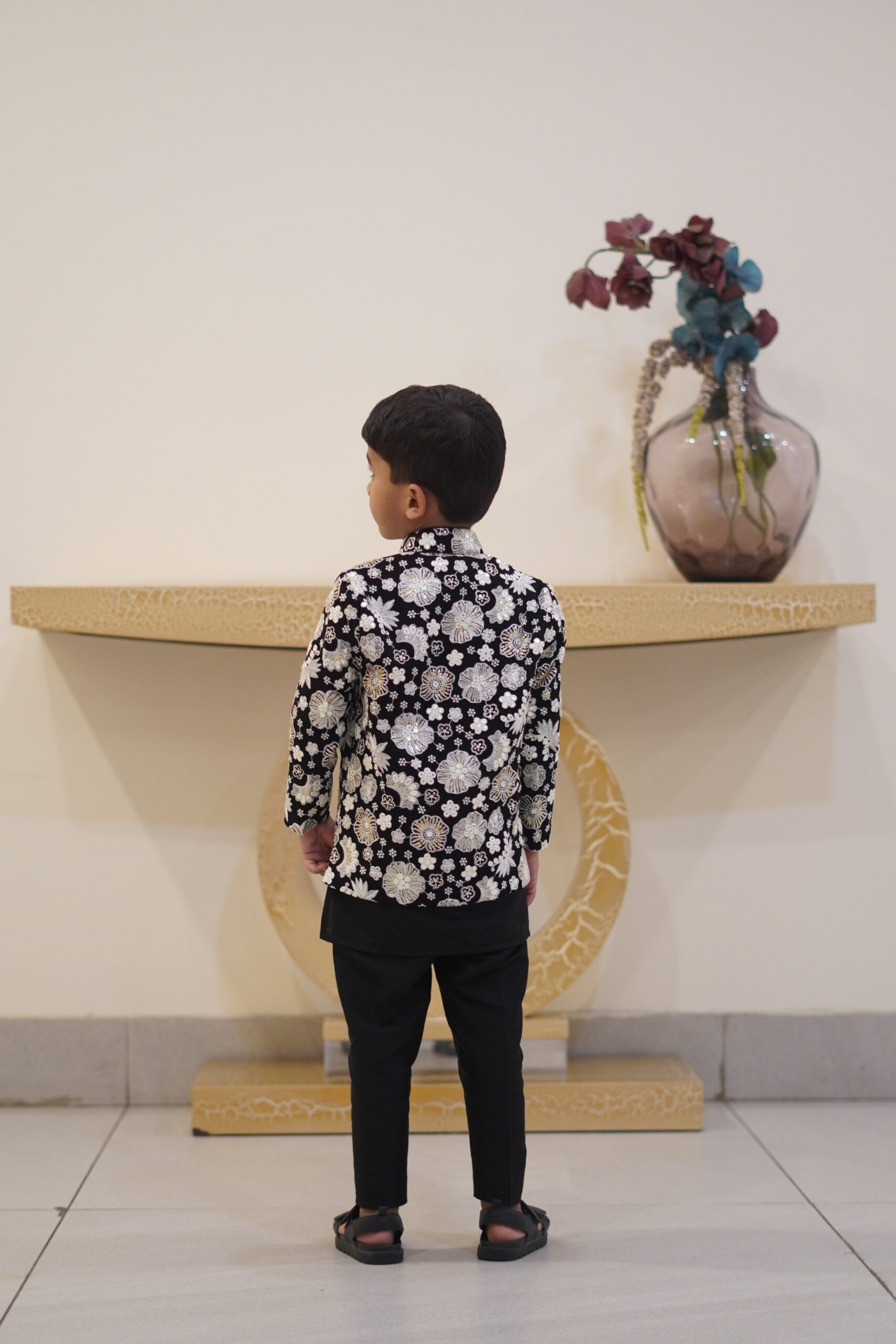 Black Embroidered Full Sleeve Jacket paired with a matching Black Kurta Set.