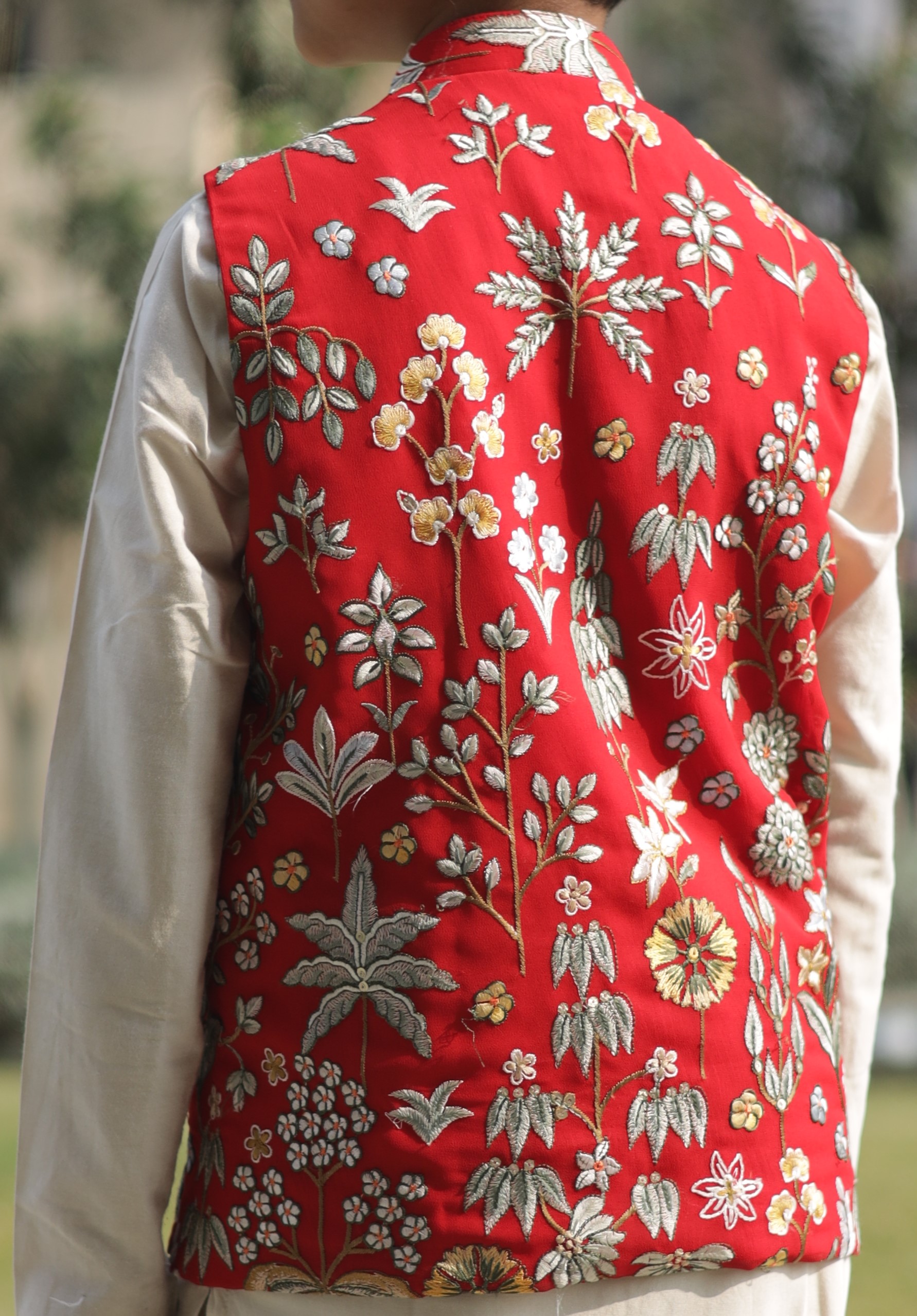 | flora embroidered jacket in multi colour on a red base jacket accompnied with a beige kurta set. |