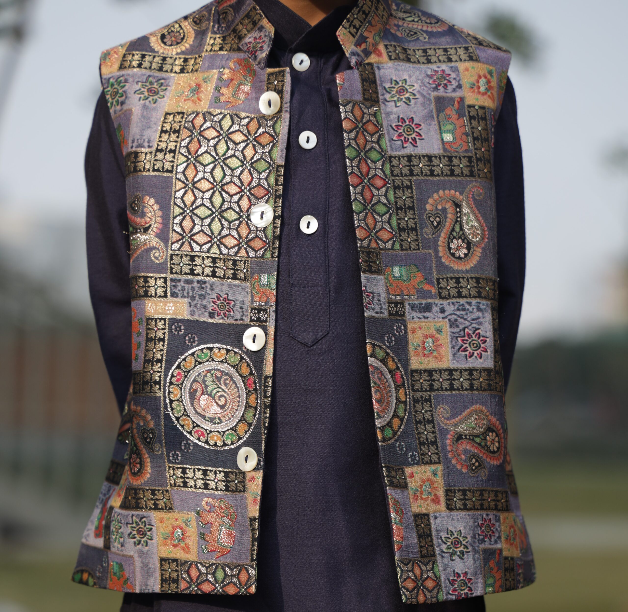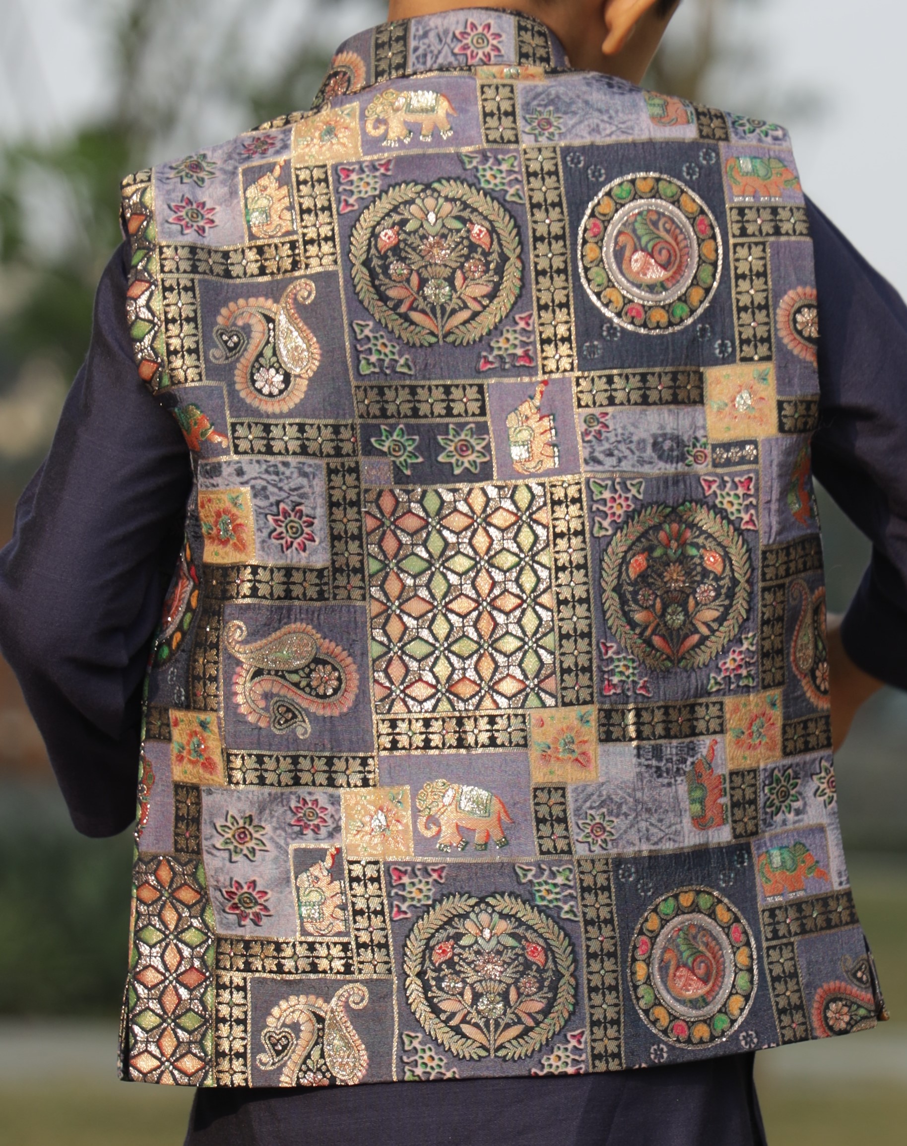 | mughal printed brocade jacket with cotton silk kurta pajama. |