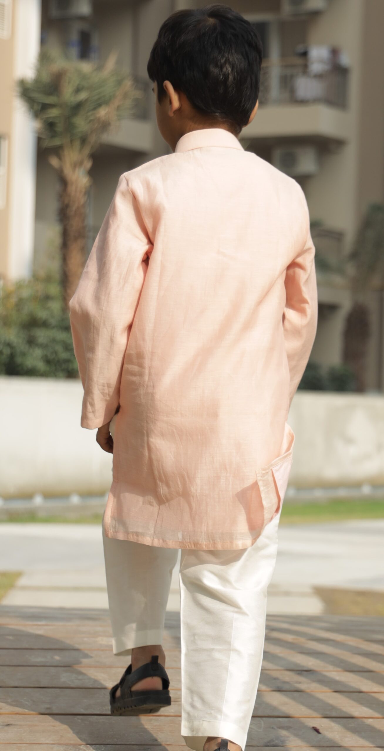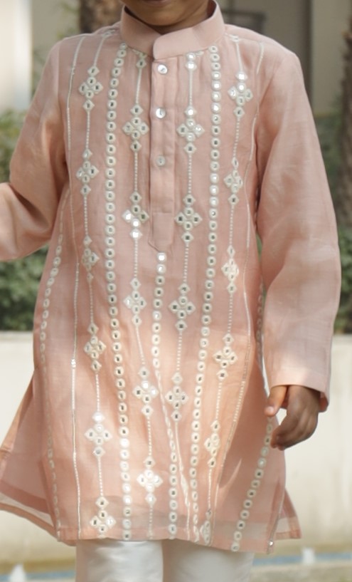 | peach colour mirror embroidered pure chanderi kurta with off white pants. |