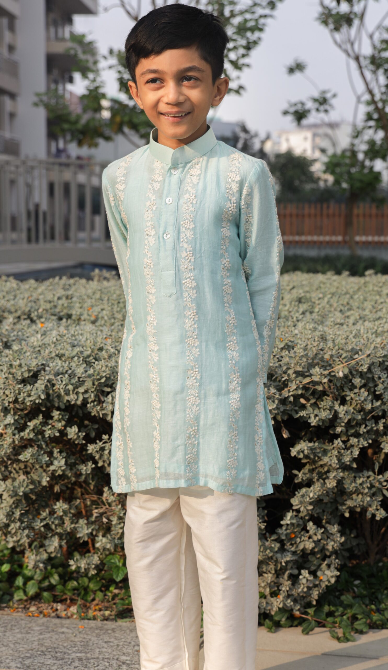 comfortable pure chandari embridered kurta in sky blue colour with pants.