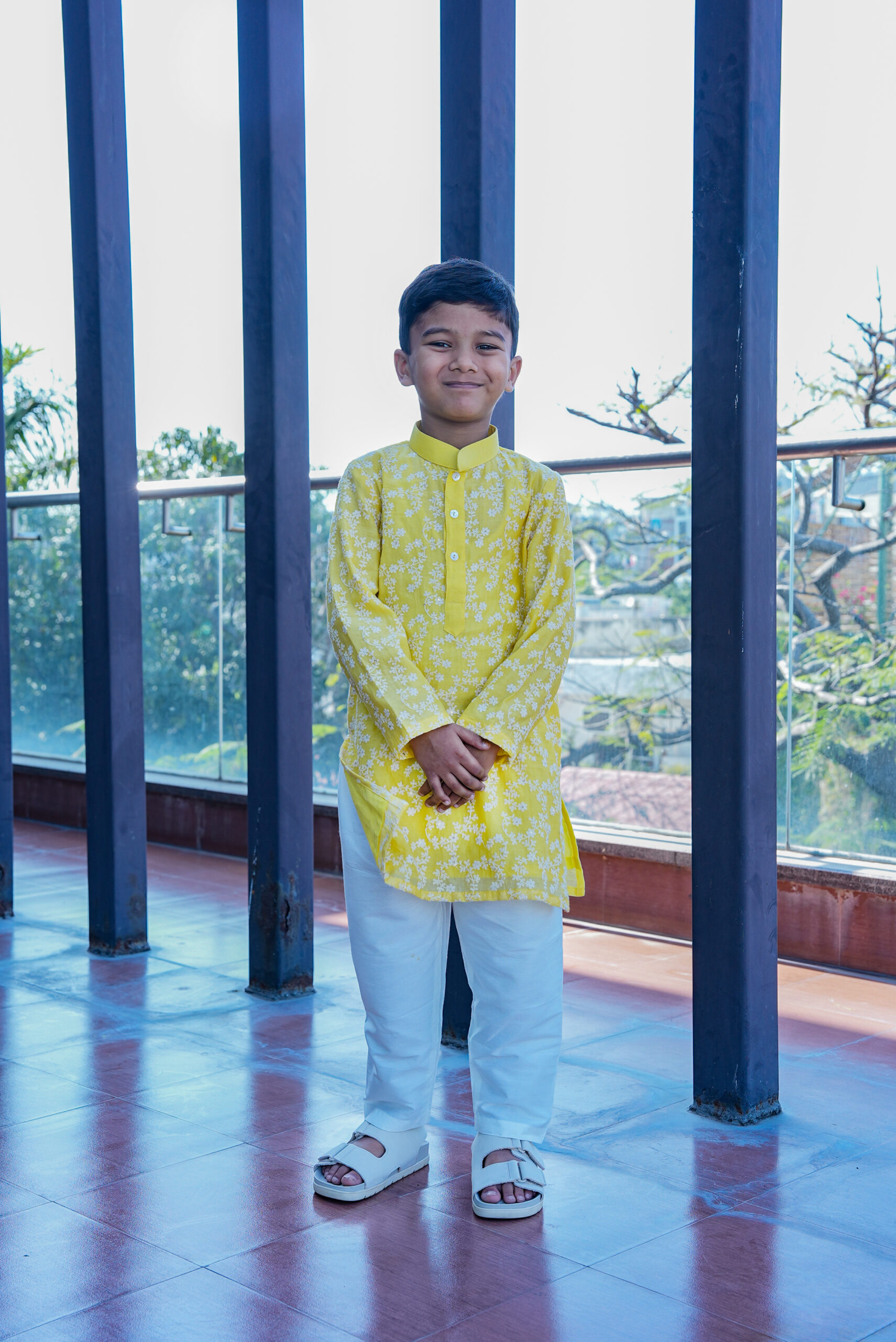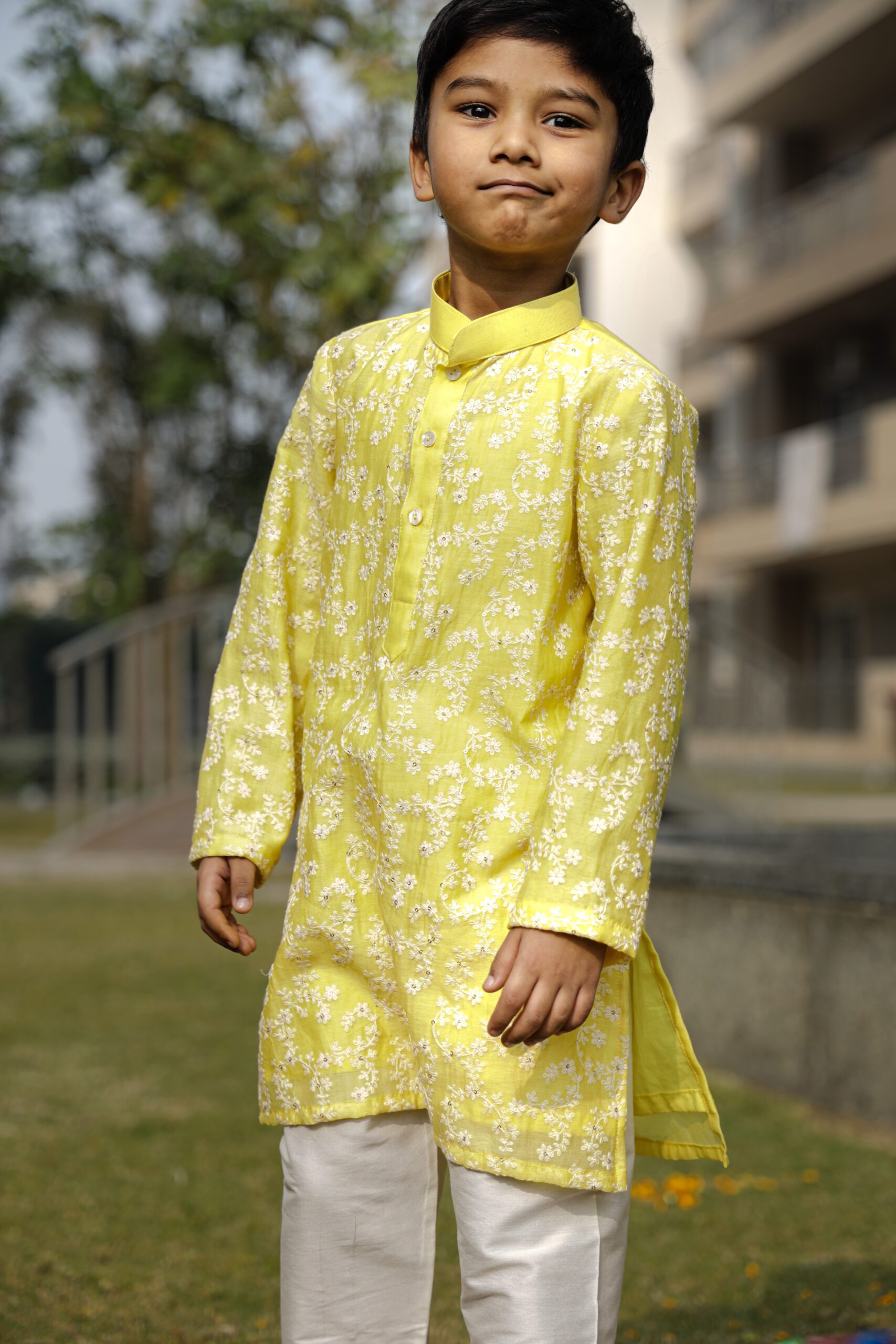| pure chandari off white floral jaal embroidry on a yellow kurta with white pants. |
