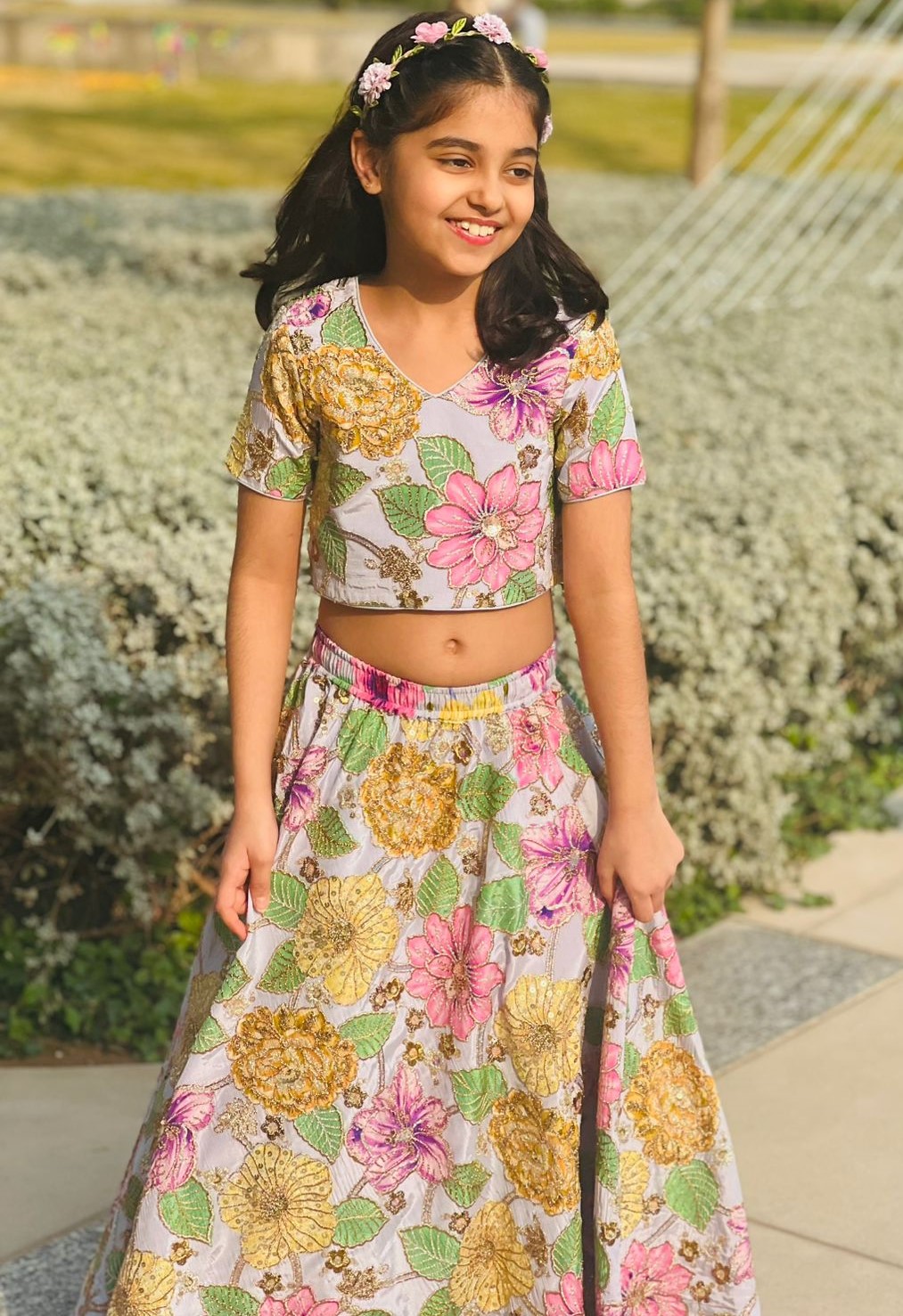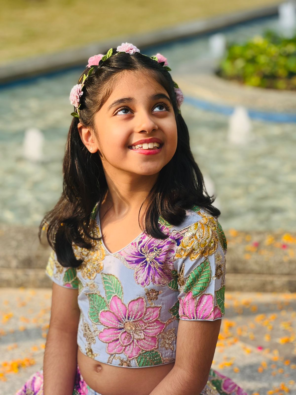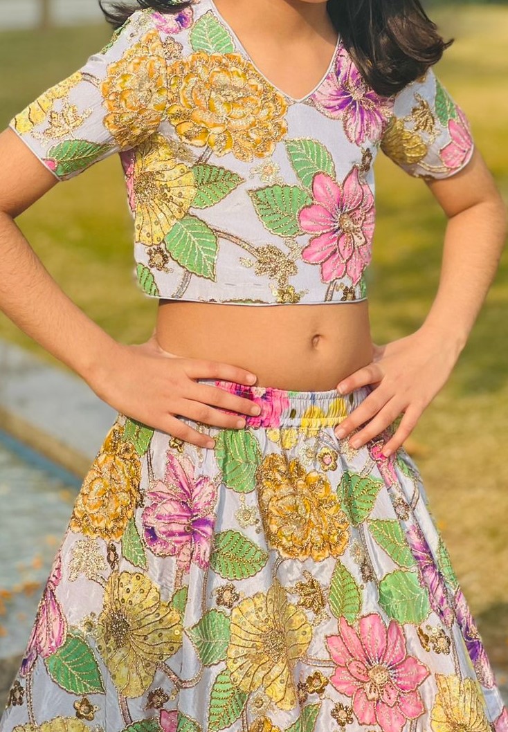 | powder blue grey floral printed lahenga.print is highlighted with zari . |