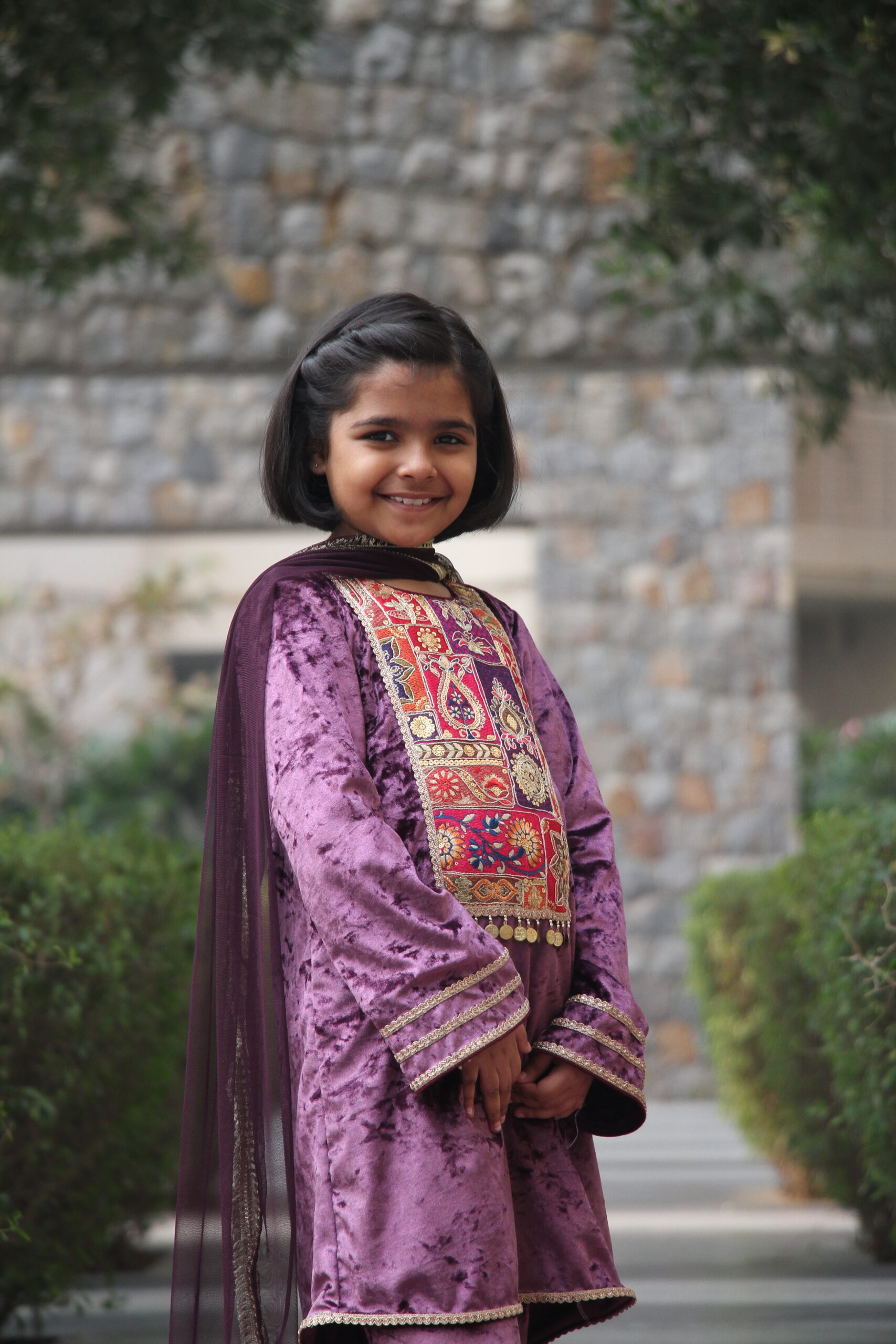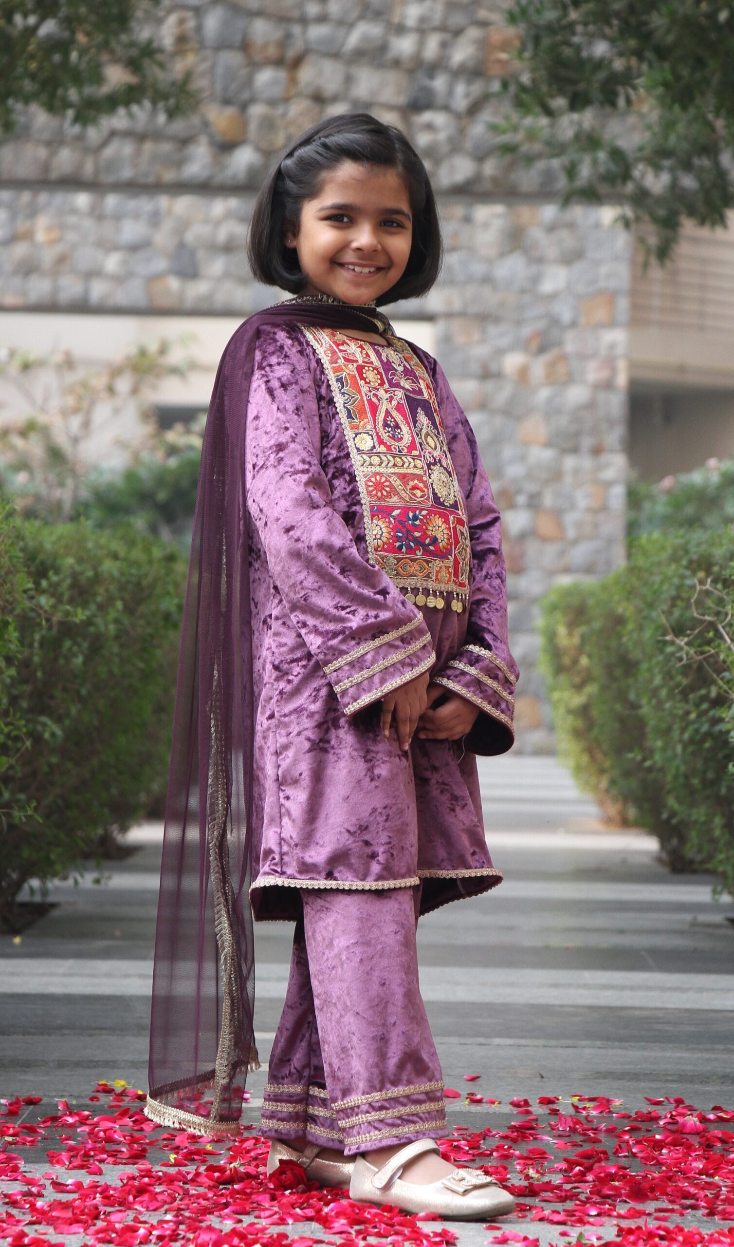Velvet Purple Kurta, featuring a meticulously threadembroidered yoke with sequin highlights.