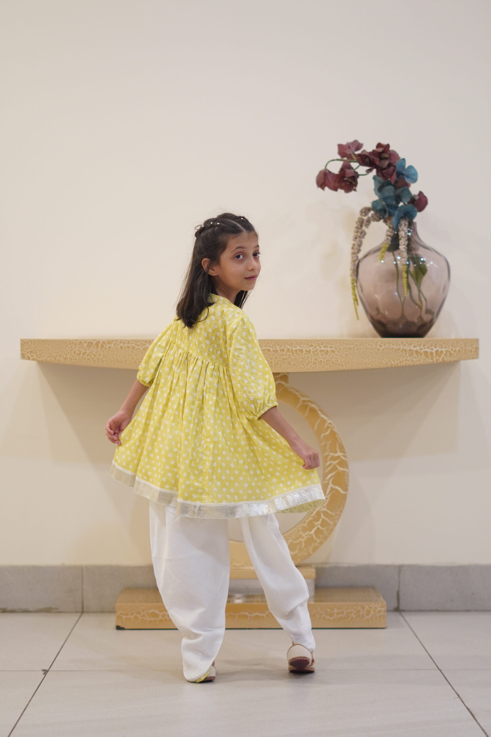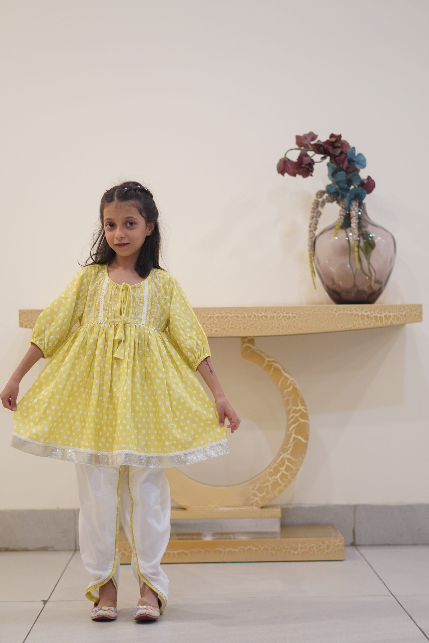| Lemon Green Suit, adorned with an off-white print pattern and intricate gota detailing, paired exquisitely with a traditional dhoti. |