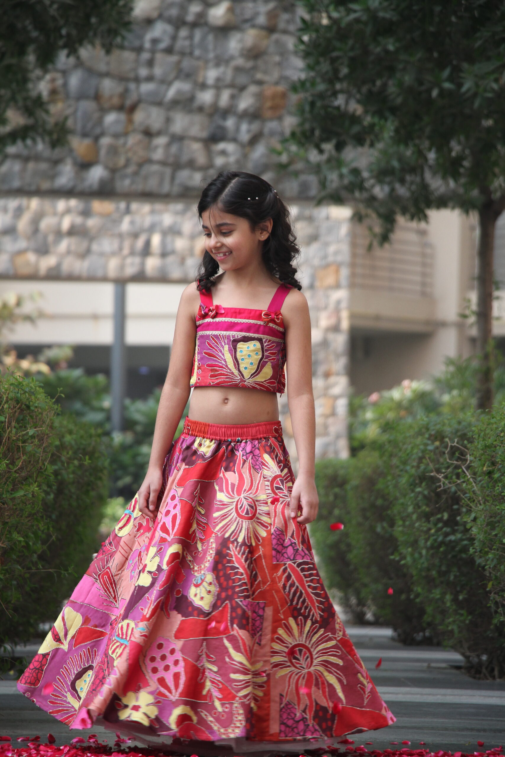 | an abstract printed lehenga paired with a strappy blouse, adorned with cute bow detailing. |